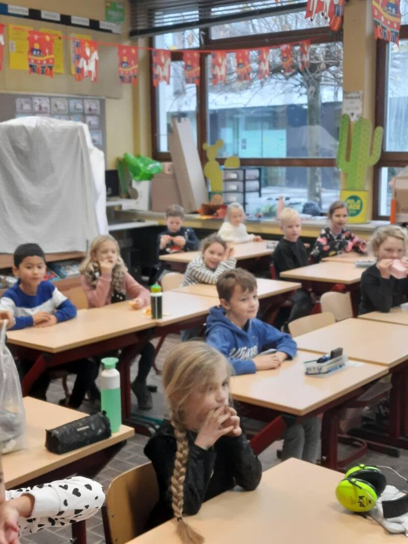We zongen nog "Dag Sinterklaasje" toen ze doorgingen. Het was fijn dat de Sint ook ons klasje niet gewoon voorbij ging!